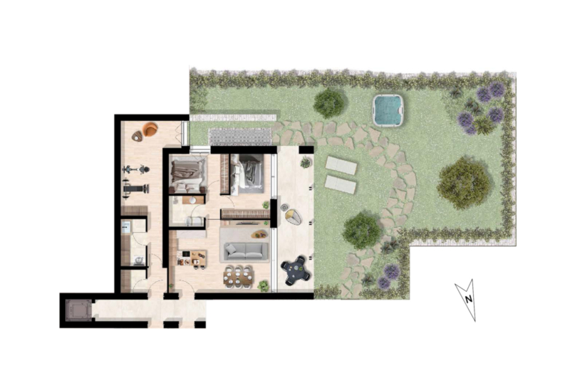 Questo esclusivo appartamento con giardino offre una zona giorno con cucina a vista, due camere da letto e un bagno. Un ulteriore spazio versatile – attualmente previsto come area fitness – dispone di un secondo bagno e si presta idealmente anche come zona ospiti o studio. L’ampio giardino con terrazza offre spazio per il relax e crea una piacevole continuità tra interno ed esterno.