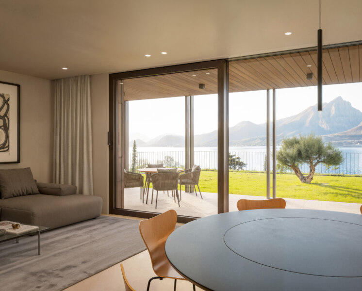 L’architettura moderna si inserisce con eleganza nell’armonioso pendio verde, valorizzando la posizione sopraelevata con ampie vetrate e spazi esterni perfettamente orientati, che regalano una vista lago mozzafiato.