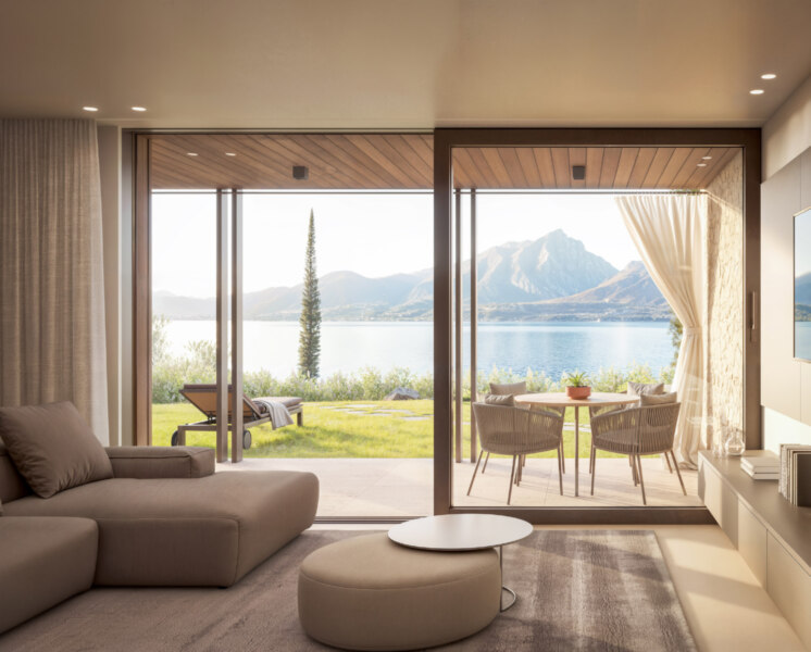 L’architettura moderna si inserisce con eleganza nell’armonioso pendio verde, valorizzando la posizione sopraelevata con ampie vetrate e spazi esterni perfettamente orientati, che regalano una vista lago mozzafiato.