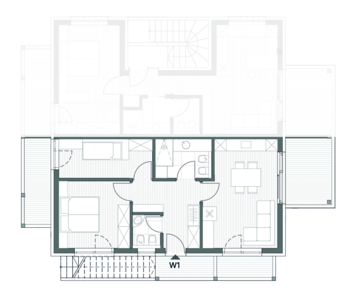 Nuovo trilocale con cucina abitabile, due camere da letto, due bagni, terrazza e due balconi. L'appartamento dispone inoltre di due posti auto in garage, un garage per biciclette e un locale per i rifiuti.