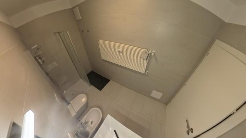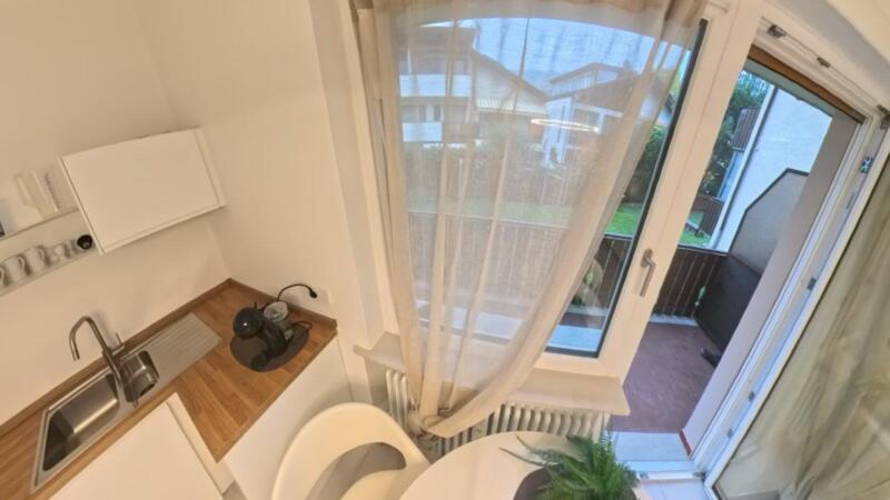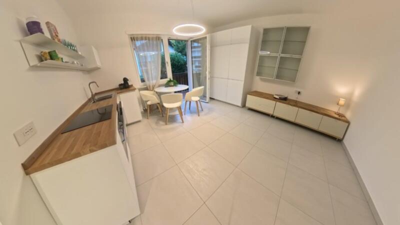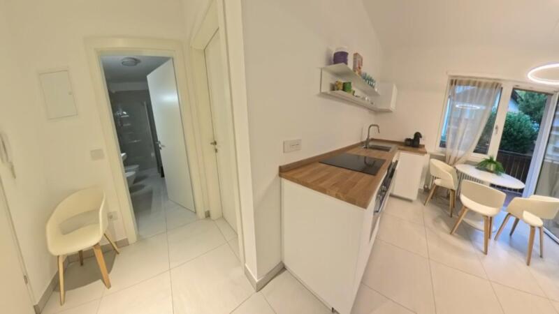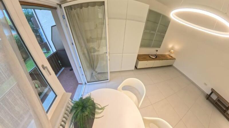 L’appartamento luminoso, esposto a nord, si trova al piano rialzato di un condominio ben curato con sole sette unità, costruito negli anni ’60. È stato ristrutturato con cura e arredato in stile moderno – pronto per essere abitato immediatamente.