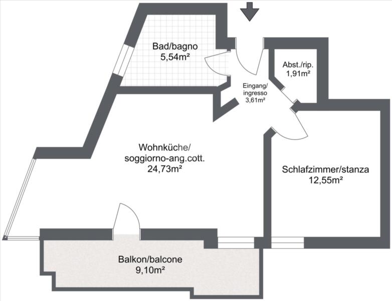 L’appartamento è composto da una zona giorno con cucina e accesso al soleggiato balcone esposto a sud-ovest, una camera da letto, un bagno finestrato con vasca e un comodo ripostiglio.
