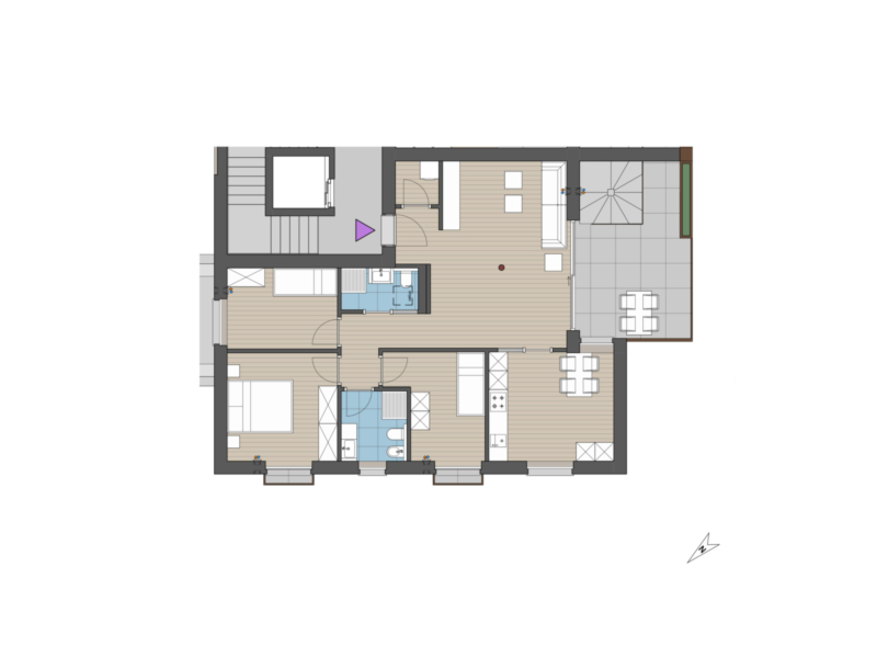 "Questo attico si trova al quarto piano di un nuovo edificio di pregio a Merano. La planimetria convince con una zona soggiorno-pranzo aperta, tre camere da letto, due bagni moderni – uno dei quali con finestra – e un pratico ripostiglio. Dal soggiorno si accede direttamente alla soleggiata terrazza esposta a sud, che amplia lo spazio abitativo all'aperto. Una particolarità è la terrazza privata sul tetto, accessibile tramite una scala esterna, ideale per rilassarsi e godersi le serate estive con vista sulla città. L'appartamento è comodamente raggiungibile con l'ascensore e si trova in una posizione centrale, vicino all'ospedale e ben servita dai mezzi pubblici. Il nuovo edificio è stato costruito secondo lo standard di una casa climatica A Nature. I garage sono disponibili a un costo aggiuntivo. Trattandosi di un nuovo edificio, è possibile tenere conto delle esigenze personali nell'arredamento degli interni e personalizzarne il design.