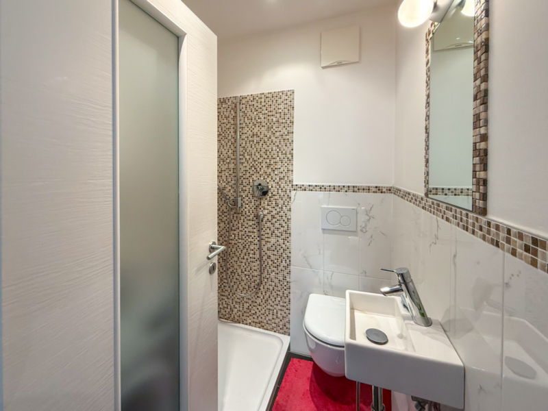 Questo appartamento ha una pianta ben organizzata. Il corridoio conduce alle due camere da letto, una delle quali ha accesso diretto alla terrazza esposta a nord-ovest. La zona notte è completata da due bagni, di cui uno finestrato. La zona giorno open space con angolo cottura è luminosa e spaziosa e offre accesso alla seconda terrazza esposta a sud. L'appartamento si trova a pochi minuti a piedi dal centro di Merano, con tutti i negozi, i caffè e i servizi pubblici nelle immediate vicinanze. Un vano cantina e un posto auto appartengono all'appartamento e completano la praticità dello spazio offerto. L'appartamento è arredato in modo convenzionale.