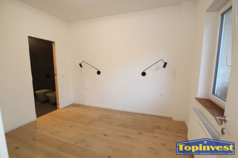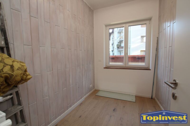 Trilocale in posizione centrale, completamente ristrutturato, 1.piano, 84 mq, suddvisi in: soggiorno con angolo cottura, 2 stanze da letto, una piccola stanza, 2 bagni, ingresso e cantina. Garage extra.
