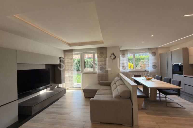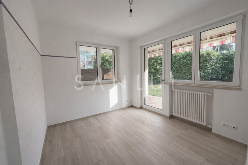 La zona giorno, luminosa grazie alle ampie superfici finestrate, offre accesso diretto alla terrazza e al giardino privato, creando un’estensione naturale dello spazio abitativo – ideale per bambini, momenti di relax o pranzi all’aperto.