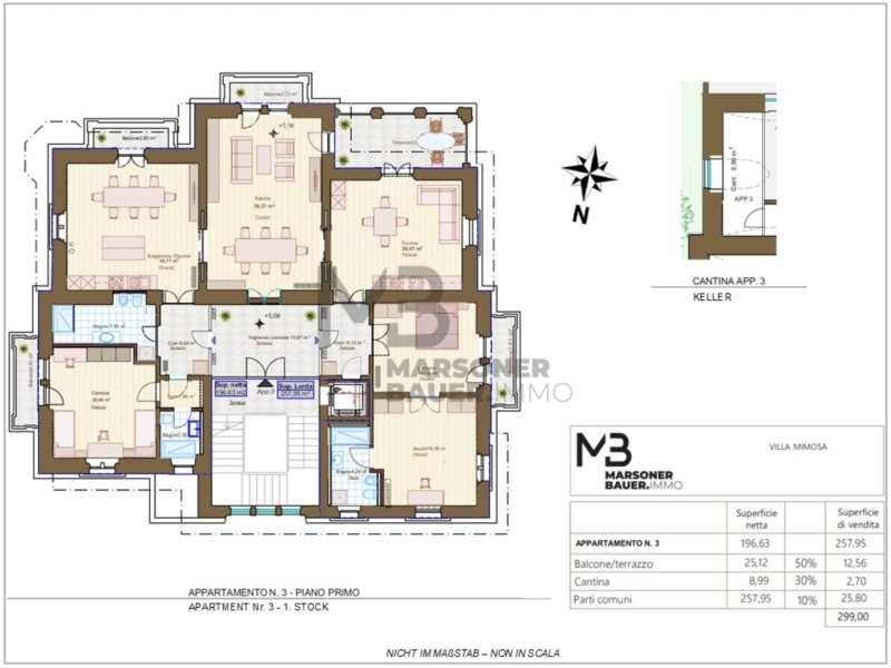 - Unità n. 3 appartamento signorile al 1° piano con una superficie netta di circa 197 m², composto da ingresso, 4 stanze, soggiorno, cucina con terrazza coperta adiacente, 3 bagni e 4 balconi;