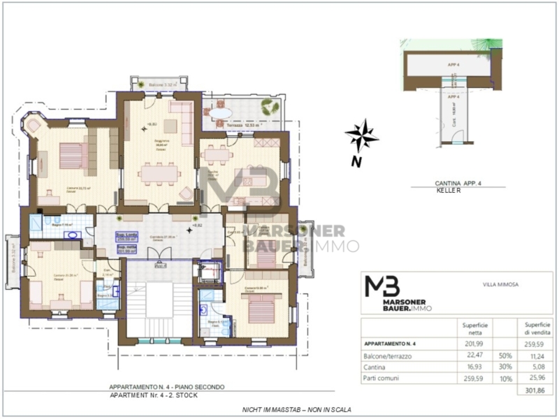 - Unità n. 4 appartamento signorile al 2° piano con una superficie netta di circa 201 m², composto da ingresso, 4 stanze (di cui 1 caratteristica stanza con bovindo), soggiorno, cucina con terrazza adiacente, 3 bagni e 3 balconi;
