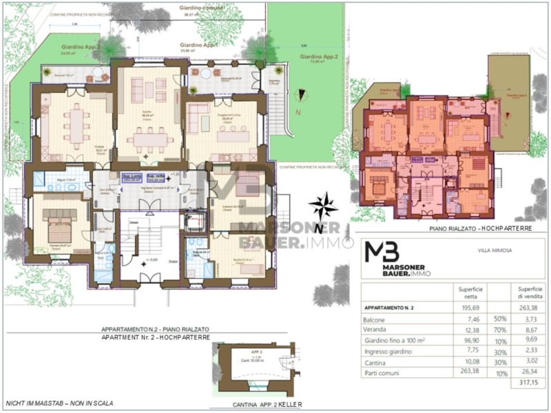 - Unità n. 2 appartamento signorile al piano rialzato con una superficie netta di circa 196 m², composto da ingresso, 4 stanze, soggiorno, cucina con veranda adiacente e scala esterna che porta al giardino privato di circa 70 m², 3 bagni e 1 balcone;