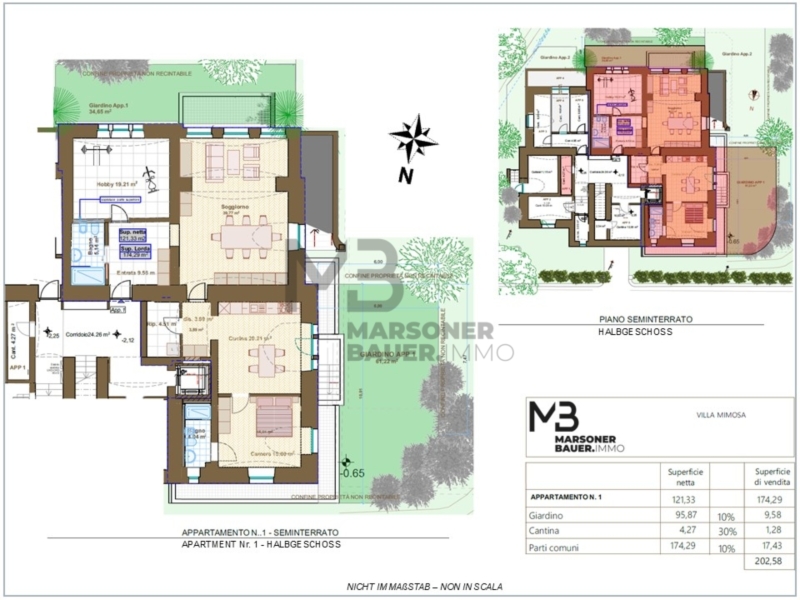 - Unità n. 1 appartamento al piano seminterrato con una superficie calpestabile di circa 120 m² con accesso interno e esterno che dispone di zona ingresso-disimpegno, locale hobby, soggiorno, cucina, stanza da letto, 2 bagni e annessa cantina/ripostiglio; questa unità è ideale anche come studio professionale e include anche un giardino privato laterale di circa 70 m²;