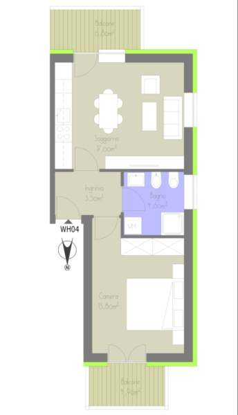 è composto da: atrio, soggiorno cucina, 2 balconi, un bagno finestrato, una camera da letto, una cantina e da un posto macchina in garage.