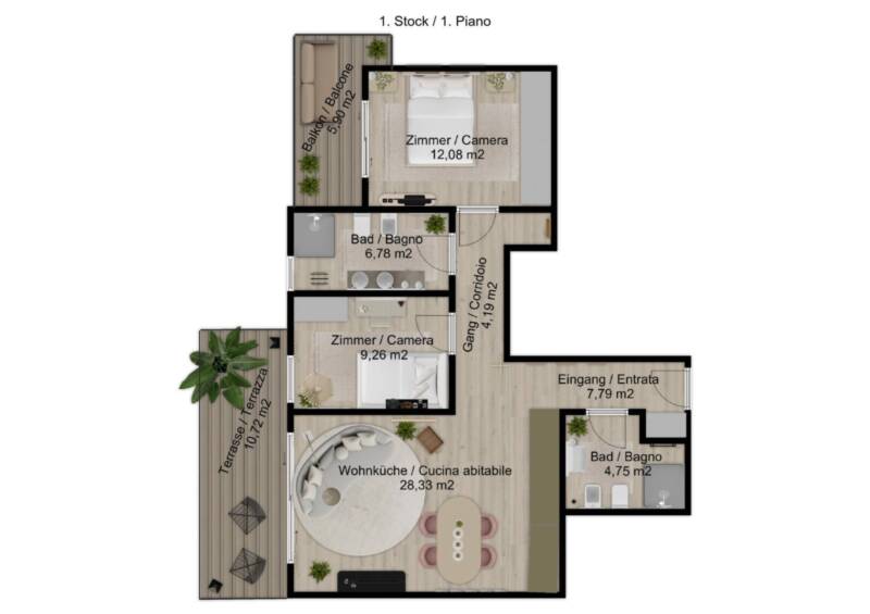 Questo trilocale di nuova costruzione al primo piano di un complesso residenziale a Montagna si distingue per la sua distribuzione funzionale e la costruzione di alta qualità. L'ingresso conduce direttamente alla luminosa zona giorno con angolo cottura, dalla quale si accede a una spaziosa terrazza, ideale per momenti di relax all'aperto. L'appartamento dispone di una camera matrimoniale con accesso diretto a una seconda terrazza privata, offrendo uno spazio esterno esclusivo. È inoltre presente una camera singola ben illuminata. Completano la proprietà due moderni bagni con doccia, garantendo il massimo comfort e funzionalità