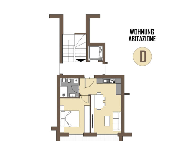 Appartamento D: Proponiamo in vendita bilocale composto da una stanza da letto, soggiorno con cucina, bagno, terrazza e cantina. L'esposizione è Sud.