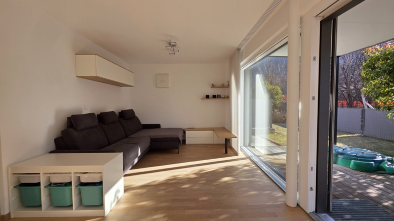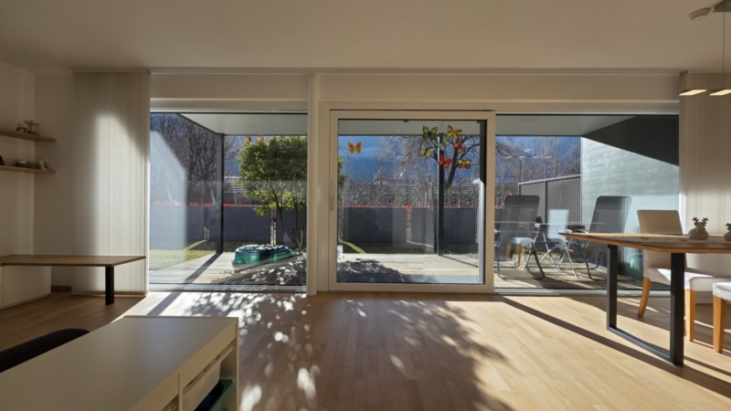Ampia zona giorno con grande vetrata esposta a sud e porta scorrevole