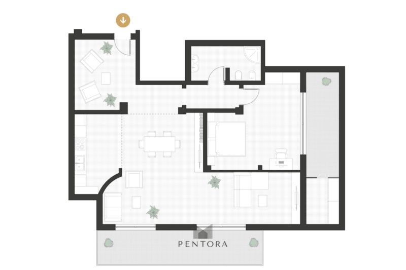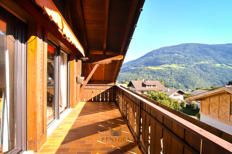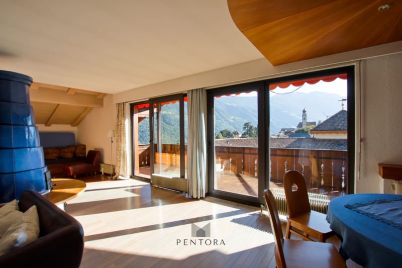 L’appartamento colpisce per le ampie vetrate che donano grande luminosità agli ambienti e per l’atmosfera accogliente. La stufa in maiolica crea calore e comfort durante la stagione più fresca. Due balconi invitano a rilassarsi e ad ammirare il panorama.