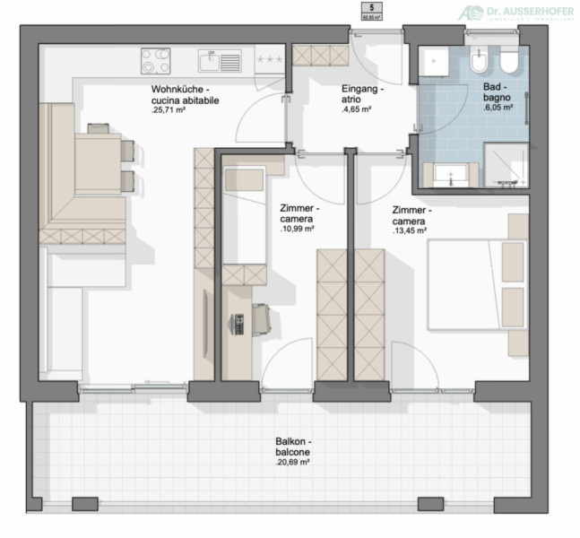 Wohnung 05: Diese perfekt eingeteilte Wohnung im ersten Stock besteht aus dem Eingangsbereich, Wohnraum mit Küche, 2 Schlafzimmer, Bad, sowie einem grosszügigen Balkon und Keller. Garagenstellplatz verfügbar.