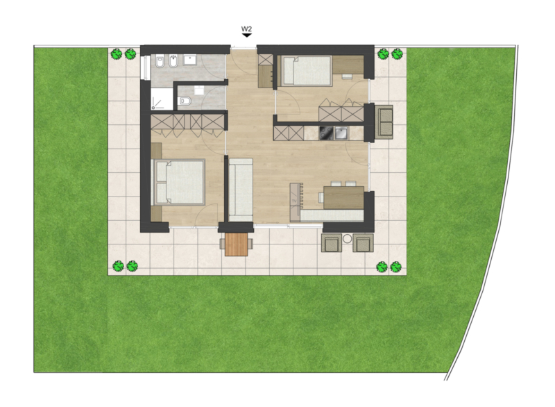 Questo trilocale al piano terra offre un comfort abitativo moderno e molto spazio. È composto da un'invitante zona d'ingresso, due accoglienti camere da letto, un bagno di alta qualità e un'ampia zona giorno/pranzo. La terrazza e il giardino invitano al relax. L'appartamento dispone anche di una cantina al 1° piano interrato.
