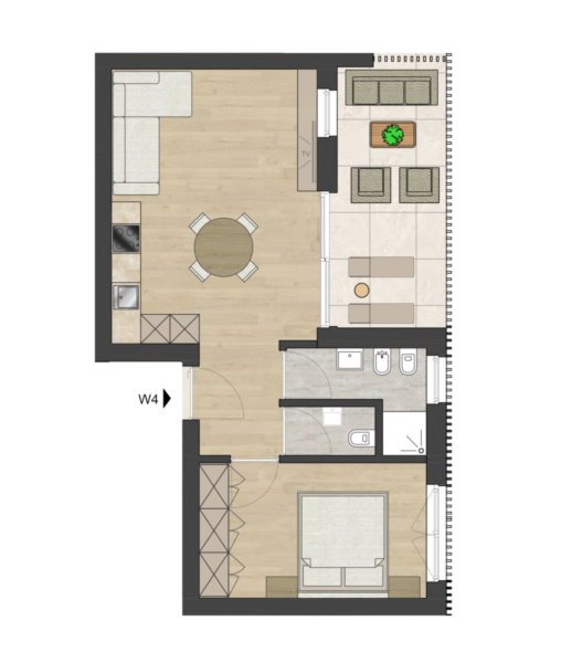 Questo bilocale al 1° piano offre un comfort abitativo moderno e molto spazio. È composto da un'invitante zona d'ingresso, un'accogliente camera da letto, un bagno di alta qualità, un WC diurno e un'ampia zona soggiorno/pranzo. La terrazza invita al relax. L'appartamento dispone anche di una cantina al 1° piano interrato.
