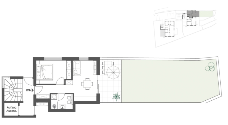Bilocale convenzionale al piano terra con terrazza e giardino. Dispone di un luminoso soggiorno/sala da pranzo con accesso diretto alla terrazza esposta a sud, una camera da letto e un bagno. L'ampio giardino di circa 80 metri quadrati è perfetto per gli amanti del giardinaggio e della vita all'aria aperta. Nel seminterrato si trova una cantina che offre ulteriore spazio di deposito. I posti auto in garage possono essere acquistati separatamente al prezzo di 30.000 €.
