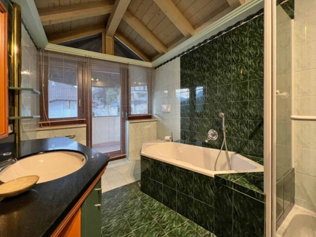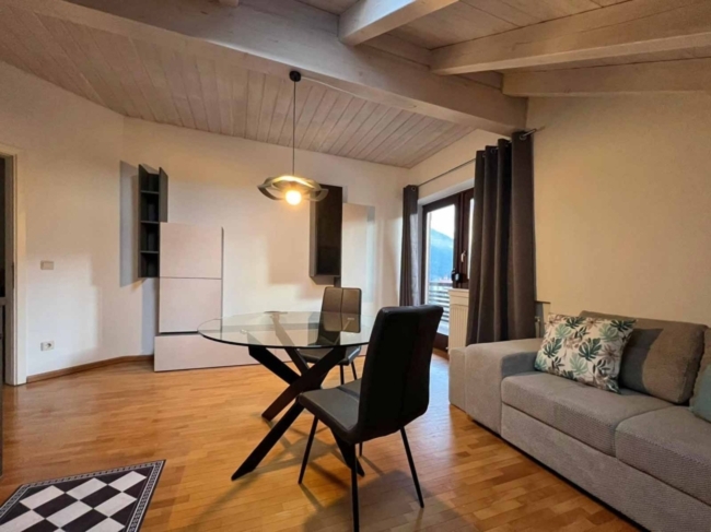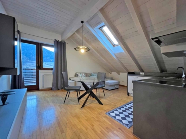 Spazioso bilocale mansardato in Via Stöcklvater a Rio di Pusteria. L'appartamento è composto da un soggiorno con cucina, una camera da letto, un bagno finestrato con doccia e vasca, tre balconi nonché una cantina ed un box auto al piano interrato.