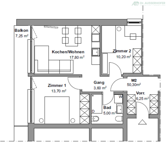 Die Wohnung setzt sich aus einem einladenen Vorraum, einem hellen Wohnbereich mit Kochnische, zwei Schlafzimmern und einer Dusche/WC. Der großzügige Balkon bietet einen freien Ausblick.
