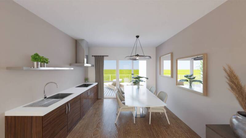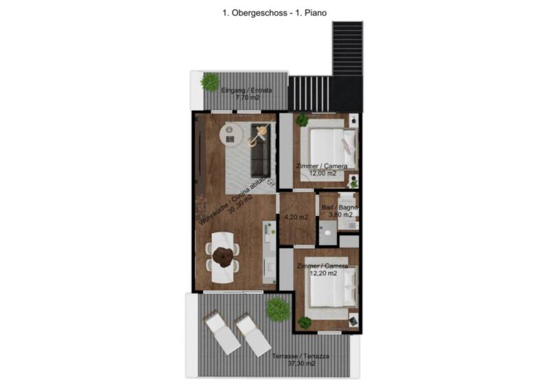 Questi eleganti appartamenti trilocali allultimo piano si distinguono per le rifiniture di alta qualità e la certificazione CasaClima A, che garantisce efficienza energetica e un comfort abitativo ottimale. Le abitazioni poste al primo e ultimo piano hanno tutte un ingresso indipendente e sono composte da unampio e luminoso soggiorno con lato cottura con accesso all ampia terrazza ideale per momenti conviviali ed di relax, un disimpegno, una camera matrimoniale, una camera doppia, un bagno finestrato e ampi spazzi per armadiature. Prezzi a partire da 330.000,00. Completano le proprietà i posto auto a 10.000,00.