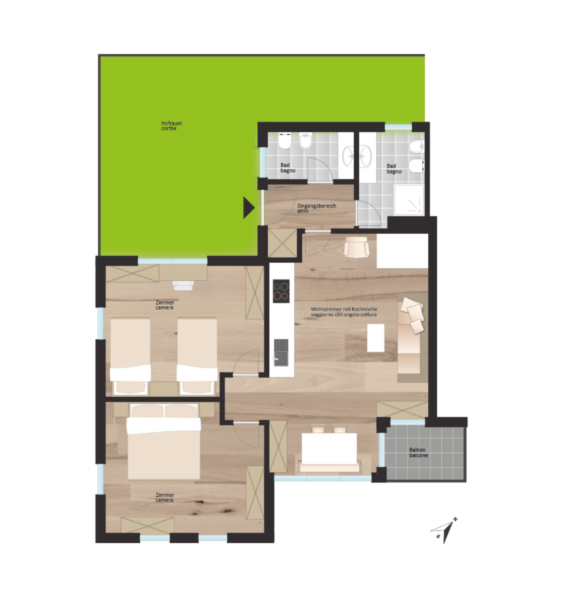 L’appartamento dispone di un ingresso indipendente con piccolo giardino e vi accoglie con una cucina-soggiorno accogliente, due camere da letto e due bagni. Una tradizionale stube diffonde un piacevole calore in tutti gli ambienti – ideale per serate rilassanti dopo una giornata in montagna. Il soleggiato balcone regala una vista panoramica impareggiabile sulle maestose vette dolomitiche, fitte foreste e prati fioriti. Boiserie tradizionali e materiali di alta qualità creano un’atmosfera calda e autentica, tipica dello stile abitativo altoatesino. L’edificio stesso, con poco più di 20 anni, è in condizioni eccellenti, quasi pari al nuovo – una vera rarità in questa posizione.