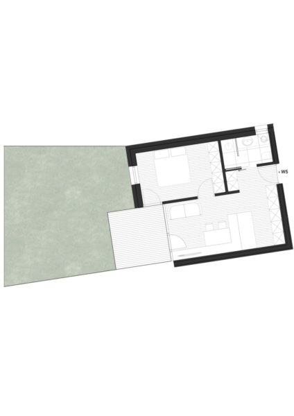 L'appartamento al piano terra comprende una luminosa cucina abitabile, un'accogliente camera da letto, un guardaroba e un bagno. Una terrazza esposta a est e il giardino di circa 44 metri quadrati completano l'offerta.