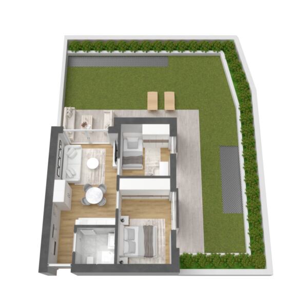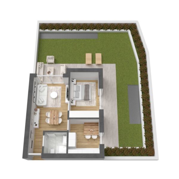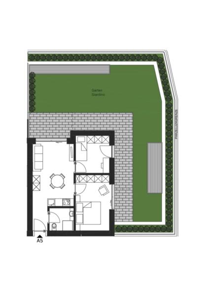 Questo trilocale al piano terra vanta una disposizione ben progettata: dispone di una cucina moderna, una confortevole zona giorno, una camera da letto e un bagno. Il giardino privato e l'ampia terrazza estendono lo spazio abitativo all'aperto, creando un rifugio idilliaco con vista sulle montagne circostanti.