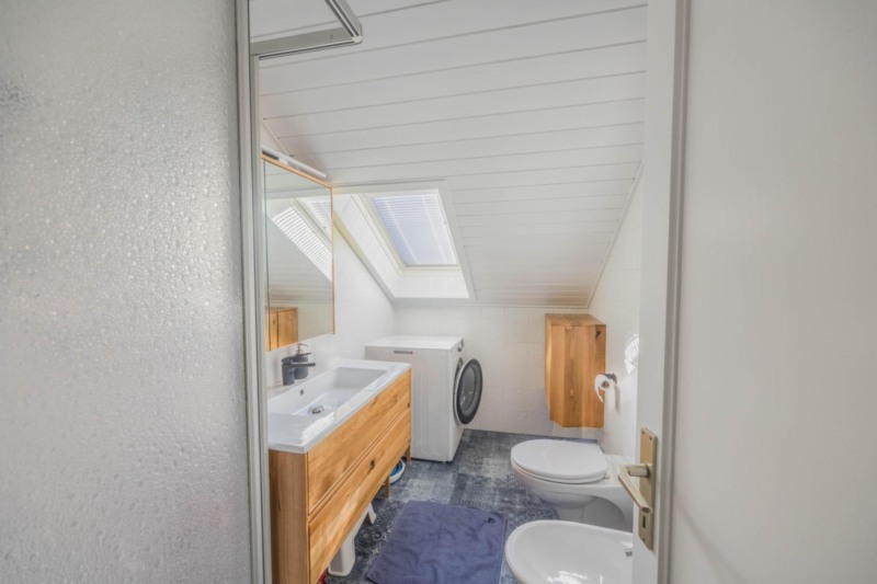 La disposizione degli spazi è ben studiata e offre un ambiente piacevole: un luminoso soggiorno, un'accogliente cucina, una camera da letto, un bagno moderno e un corridoio costituiscono la zona giorno principale. Una scala conduce alla mansarda aperta, che può essere utilizzata in modo flessibile come studio, ufficio o camera per gli ospiti: un vero vantaggio per chi desidera spazio aggiuntivo.