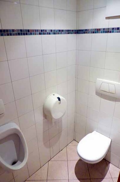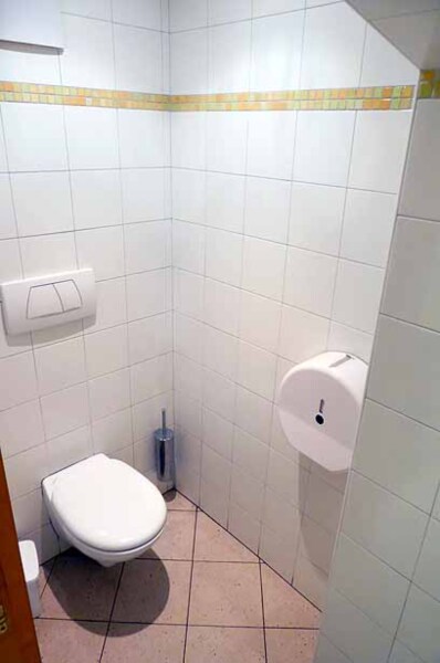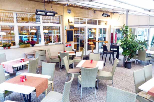 Vor dem Eingang befindet sich eine vollkommen eingehauste Terrasse, ebenfalls mit rund 36 Sitzplätzen – ein großer Vorteil, der das ganze Jahr über genutzt werden kann und wesentlich zum Erfolg des Betriebs beiträgt.