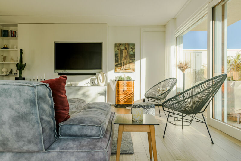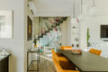 Der Eingang im Erdgeschoss führt direkt in den großzügigen Wohn- und Essbereich mit Blick in den privaten Garten. Große Schiebetüren aus Glas sowie die optimale Ausrichtung sorgen den ganzen Tag über für eine ausgezeichnete natürliche Belichtung. Der Garten und die überdachte Terrasse schaffen ein entspanntes und einladendes Ambiente – ideal, um angenehme Stunden mit Familie oder Freunden zu verbringen. Ergänzt wird diese Ebene durch ein Gäste-WC sowie einen Abstellraum.