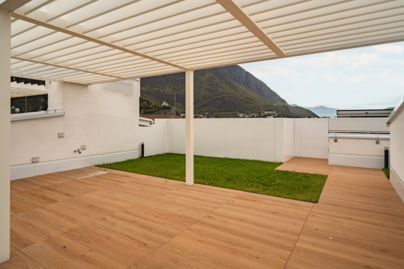 Ein Penthouse mit atemberaubender Südausrichtung und offenen Flächen auf zwei Seiten. Im Inneren sorgt eine durchdachte Raumaufteilung für eine Atmosphäre von Eleganz und Komfort. Eine geräumige Wohnküche lädt Sie ein, die Freude am Kochen zu entdecken, während das helle und großzügige Wohnzimmer eine Oase des Wohlbefindens und der Unterhaltung verspricht. Die beiden Hauptschlafzimmer sind wahre Rückzugsorte der Entspannung, jedes mit eigenem Badezimmer, eines davon mit Fenster. Auf der Etage finden Sie einen nach Norden ausgerichteten Balkon, der die Räume umarmt und einen bezaubernden Ausblick bietet. Doch die wahre Überraschung ist die geräumige, überdachte Terrasse. Und dann das Dachgeschoss. Ein wahres Paradies über den Wolken, erreichbar von der Terrasse aus, wo ein Garten und eine gepflasterte Fläche mit Pergola eine ideale Kulisse für Entspannung schaffen.