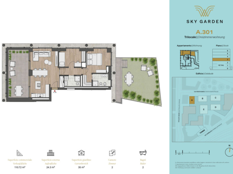 WOHNUNG A301 - Sky Garden A: Zum Verkauf steht eine neue Dreizimmerwohnung mit Terrasse und Privatgarten im 3. OG - interne Einteilung wie folgt: Eingang, Wohnraum mit Küche, 2 Schlafzimmer, Badezimmer, Tages-WC, Terrasse und Privatgarten. Eines der Schlafzimmer verfügt über ein eigenes Badezimmer sowie einen begehbaren Kleiderschrank.