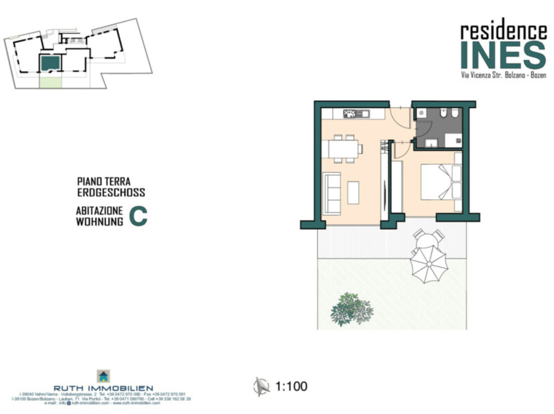 Einteilung wie folgt: Eingangsbereich, Wohnraum mit Küche, 1 Schlafzimmer, 1 Badezimmer, Terrasse und Privatgarten von knapp 40 m².