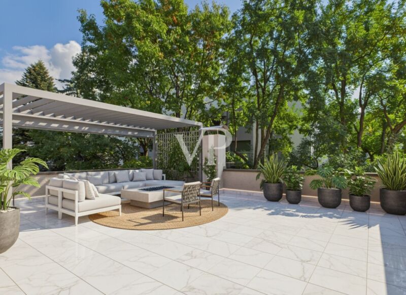 Der Schlafbereich umfasst zwei komfortable Doppelschlafzimmer, beide mit Zugang zu einem zweiten, mehr als 10 m² großen Balkon, ein stilvolles Arbeitszimmer, zwei großzügige Badezimmer sowie ein geschickter Abstellraum. Eine elegante Innentreppe führt auf die 65 m² große Dachterrasse – ein echtes Panorama-Penthouse mit Außenküche, Whirlpool oder Schwimmbad und gemütlicher Lounge-Zone. Wie in den Projekt-Renderings dargestellt, entsteht hier ein exklusiver Rückzugsort für Entspannung und Geselligkeit.