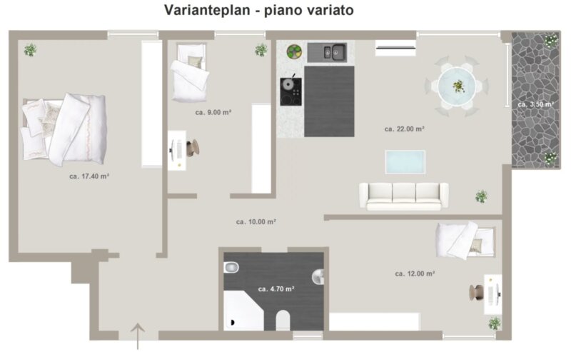 Die Wohnung verfügt über einen einladenden Wohnbereich, der durch große Fenster mit Licht durchflutet wird. Die Küche ist separat angeordnet und ermöglicht eine klare Trennung zwischen Wohn- und Kochbereich. Zwei gut geschnittene Schlafzimmer bieten ausreichend Platz für individuelle Gestaltungsmöglichkeiten. Das Badezimmer ist funktional gestaltet. Der Balkon erweitert den Wohnraum nach ausen und eignet sich ideal für entspannte Momente im Freien. Indem man die Küche ins Wohnzimmer verlegt, würde ein zusätzliches Schlafzimmer entstehen, wobei der Wohnbereich jedoch verkleinert würde und zu einem gemeinsamen Raum mit der Küche wird. Ergänzt wird das Angebot durch einen praktischen Keller sowie eine Garage, die zusätzlichen Stauraum und Komfort gewährleisten.