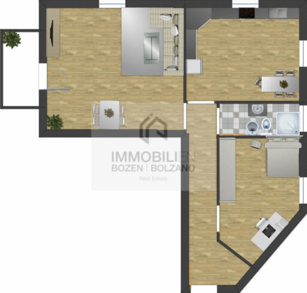 Die Wohnfläche gliedert sich in einen Eingangsbereich mit Flur, eine separate Wohnküche, ein Wohnzimmer mit Balkon, ein Schlafzimmer sowie ein Badezimmer mit Fenster. Zur Wohnung gehören außerdem ein Keller und ein Dachboden, die zusätzlichen Stauraum bieten. Im Innenhof des Kondominiums stehen gemeinschaftlich Autostellplätze zur Verfügung.