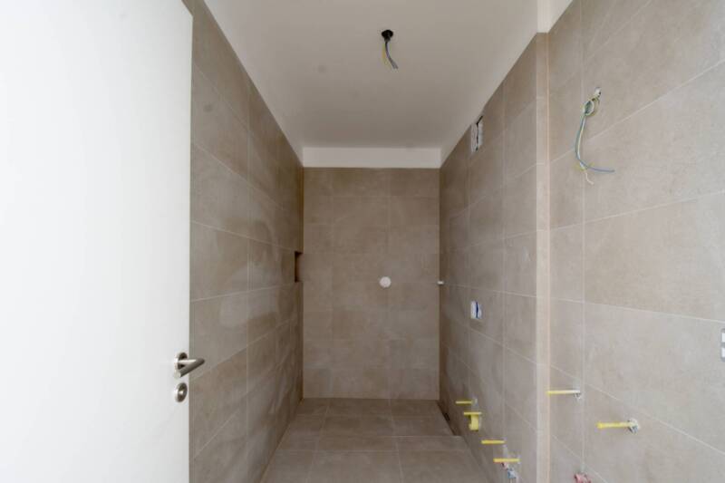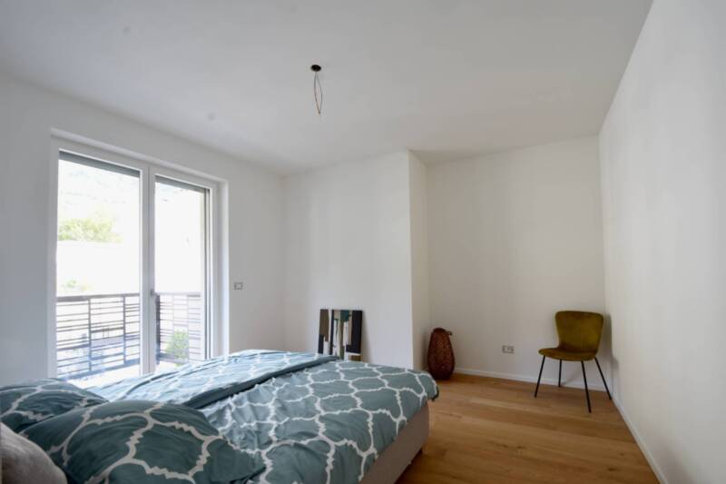 Die Ausstattung der Wohnung ist auf einem hohen Niveau: elegante Holzparkettböden verleihen den Räumen eine warme Atmosphäre, und die dreifach verglasten Fenster mit elektrischen Rollläden sorgen für Ruhe und optimale Dämmung. Die Fußbodenheizung und das zentrale Lüftungssystem gewährleisten ein angenehmes Raumklima zu jeder Jahreszeit. Die Sanitäreinrichtungen aus weißer Keramik unterstreichen den modernen und funktionalen Charakter der Wohnung.