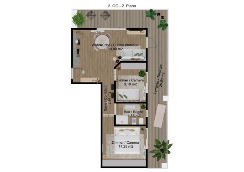 Die Wohnung verfügt über eine Terrasse, die sowohl vom Schlafzimmer als auch von der Wohnküche aus zugänglich ist. Sie bietet die Möglichkeit, frische Luft zu genießen und die Wohnung um einen Außenbereich zu erweitern.