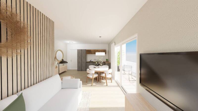 Diese elegante 3-Zimmer-Wohnung im 2. Obergeschoss eines hochwertigen Neubaus überzeugt durch ihr modernes Design und hohen Wohnkomfort. Der helle Wohnbereich mit integrierter Küche schafft eine offene und einladende Atmosphäre, während die beiden Schlafzimmer vielfältige Nutzungsmöglichkeiten bieten ideal für Familien, Paare oder als Kombination aus Haupt- und Gästezimmer. Das Badezimmer ist stilvoll gestaltet und mit hochwertigen Materialien ausgestattet.