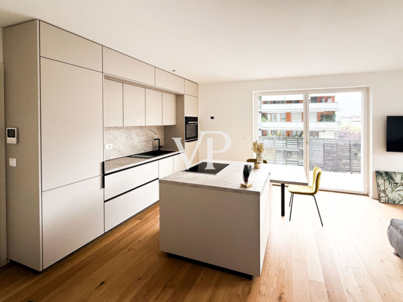 Diese exklusive und moderne Wohnanlage wurde nach dem höchsten Standard der Klimahaus-Klasse „A“ realisiert. Die zum Verkauf stehende Einheit befindet sich im ersten Obergeschoss und überzeugt durch eine durchdachte Raumaufteilung: ein einladender Eingangsbereich, ein lichtdurchfluteter Wohn- und Essbereich mit Zugang zur rund 15 m² großen Terrasse, ein großzügiges Doppelzimmer, ein weiteres Einzelzimmer sowie ein Tageslichtbad mit Fenster.