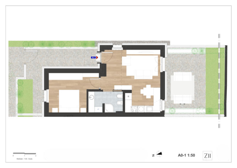 Wir stellen Ihnen diese Erdgeschosswohnung mit der Bezeichnung A0-1 vor. Sie verfügt über eine Nord-Ost-Süd Ausrichtung und ist auf drei Seiten frei. Die Innenaufteilung umfasst einen großzügigen Wohnbereich mit Wohnzimmer und offener Küche, ein Schlafzimmer mit Doppelbett und ein Badezimmer. Doch die wahre Überraschung ist der große nach Süden ausgerichtete Garten, der zusammen mit dem kleineren nach Norden ausgerichteten Garten eine Oase der Entspannung bildet – ein intimer Ort, ideal für Abendessen unter den Sternen und Momente des reinen Wohlbefindens. Darüber hinaus verfügt die Wohnung über einen eigenen Eingang. Im Angebot enthalten ist ein Keller und als Extra besteht die Möglichkeit, einen oder mehrere Garagen in verschiedenen Größen zu erwerben. Das Projekt Z11, das vom renommierten Studio Work Architects des Architekten Renzo Gennaro entworfen wurde, sieht den Einsatz von hochleistungsfähigen Isoliermaterialien und Fenstern vor. Die Anwendung von technischen Lösungen zur Schalldämmung sowie die Fußbodenheizung/Kühlung mittels Wärmepumpen, die von Photovoltaikpanelen gespeist werden, ermöglichen es dem Projekt, die energetischen Anforderungen für die Einstufung als "CasaClima A Nature" zu erfüllen, was erhebliche Energie- und Kosteneinsparungen garantiert. Die Einheit wird mit einem Smart-Home-System ausgestattet sein, das verschiedene Funktionen wie Raumtemperaturregelung, Automatisierung der Rollläden, Anbindung und Steuerung des Einbruchschutzsystems sowie die Beleuchtungssteuerung verwalten kann. Außerdem wird es einen Bereich für digitale Paketzustellung geben. All das macht ZARA ELEVEN zu Ihrem Zuhause der Zukunft.