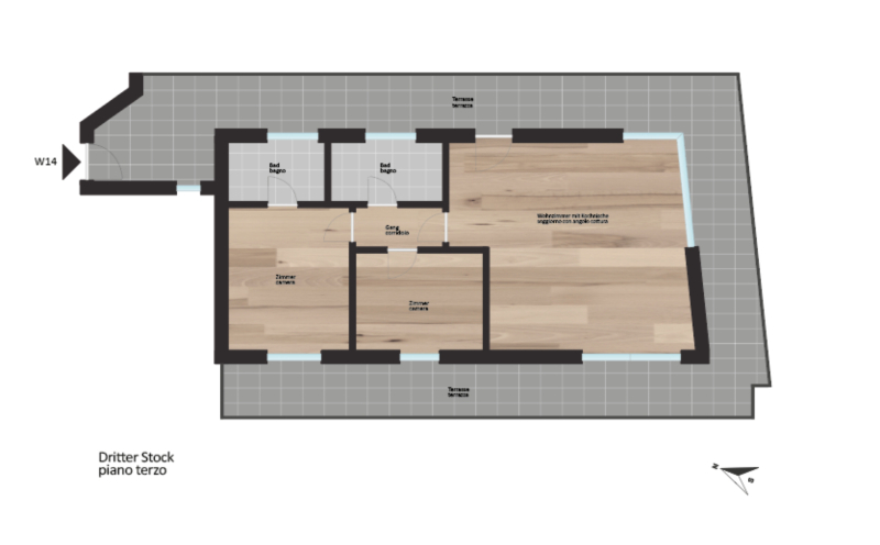 Diese Dreizimmerwohnung im 3.Obergeschoss verfügt über einen gemütlichen Wohnbereich mit Küchenzeile, zwei Schlafzimmer und zwei moderne Badezimmer. Die große Terrasse und die zwei Balkone laden dazu ein, den Ausblick und entspannte Momente zu genießen.