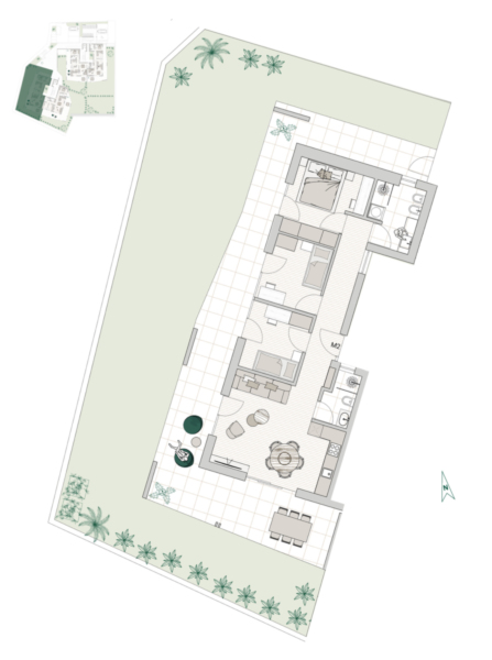 Die Wohnung befindet sich im Erdgeschoss (Haus M) und besteht aus einer geräumigen Wohnküche, drei Schlafzimmern, zwei Bädern, einer Terrasse mit großem Garten und einem Kellerraum. Eine Garagenbox kann zusätzlich erworben werden.