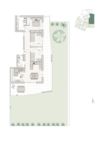 Die Wohnung befindet sich im Erdgeschoss (Haus H) und besteht aus einer geräumigen Wohnküche, drei Schlafzimmern, zwei Bädern, einer Terrasse mit großem Garten und einem Kellerraum. Eine Garagenbox kann zusätzlich erworben werden.