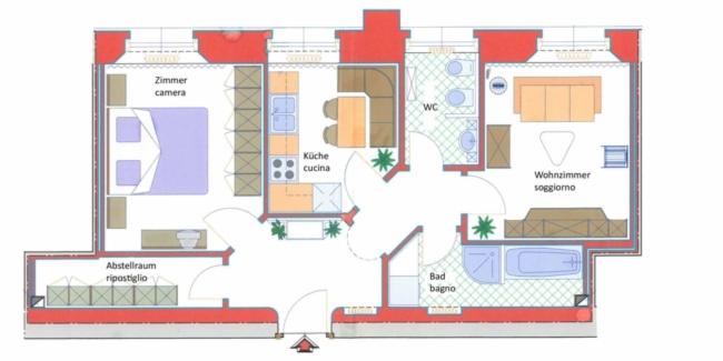 Geräumige 2-Zimmerwohnung im Hochparterre in Brixen bestehend aus einem Wohnzimmer, einer separaten Küche, einem Schlafzimmer, WC mit Fenster, Badezimmer mit Dusche und Wanne, einem Abstellraum sowie einem großen Keller und einem Dachboden (ca. 12 m²). Kondominiale Autoabstellplätze im Freien sind vorhanden.