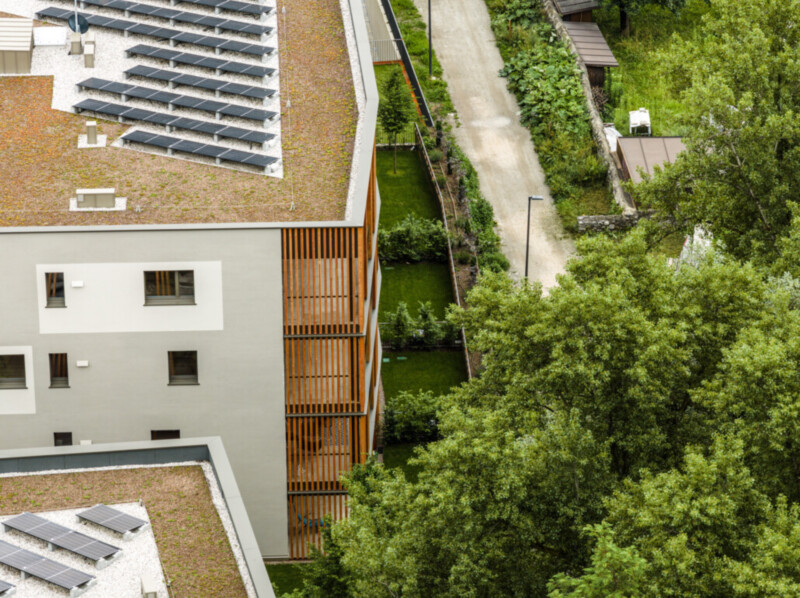 Die Wohnhäuser sind am Fernwärmenetz angeschlossen; die Gemeinschaftsflächen beziehen den Strom über eine Photovoltaikanlage.