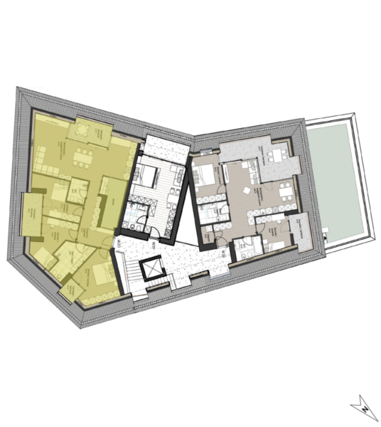 Im Dachgeschoss befindet sich diese geräumige Vierzimmerwohnung, die über eine große Wohnküche, drei Schlafzimmer, ein Badezimmer, ein Gäste-WC, drei Terrassen und einen Garten verfügt. Zusätzlich gibt es einen Keller im 2. Untergeschoss.