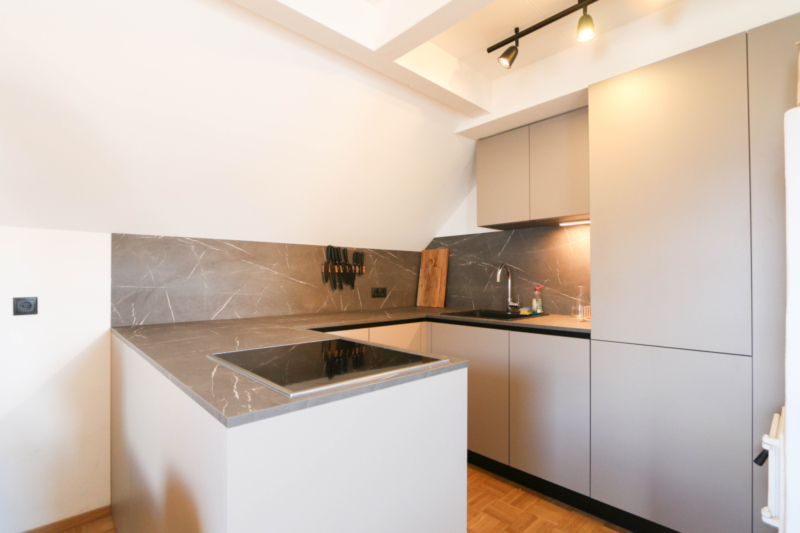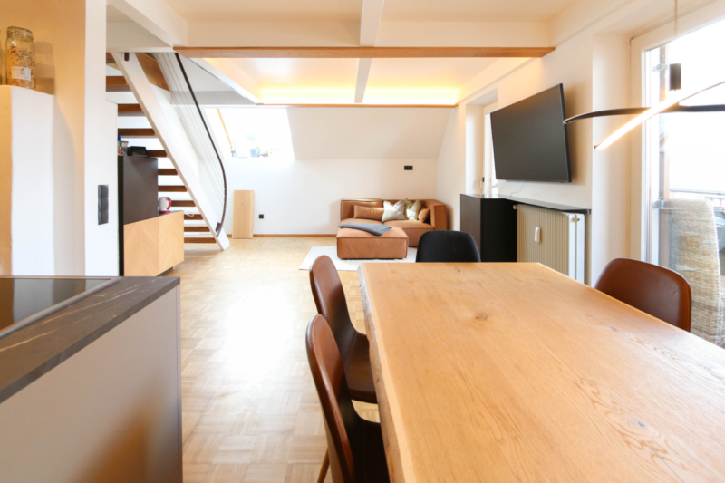 Der offene Wohnbereich überzeugt durch ein modernes, großzügiges Raumkonzept und eine stilvolle Einbauküche, die sich harmonisch in das elegante Gesamtbild einfügt. Hochwertige Oberflächen, durchdachte Lichtgestaltung und maßgefertigte Einrichtungselemente sowie ein Holzofen verleihen der Wohnung ein besonderes Ambiente.